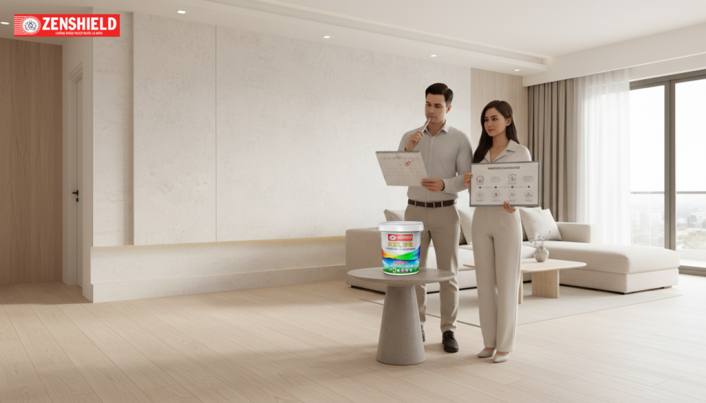 Sau khoảng 3-5 năm sử dụng, lớp chống thấm bề mặt (đặc biệt là sàn mái lộ thiên và tường ngoài) sẽ bắt đầu có dấu hiệu lão hóa do tia UV. Đây là lúc cần vệ sinh sạch sẽ, trám vá các vết nứt nhỏ và có thể quét thêm một lớp phủ bảo vệ mới (Topcoat) để khôi phục khả năng kháng nước.